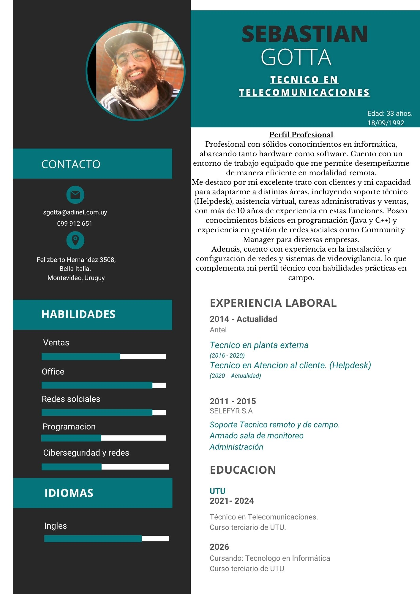 Profesional con más de 10 años de experiencia en informática, hardware y software. Técnico en Telecomunicaciones (UTU) y cursando Tecnólogo en Informática. Especialista en soporte técnico remoto, helpdesk, instalación de redes y videovigilancia. Trato cercano desde Montevideo, Uruguay.